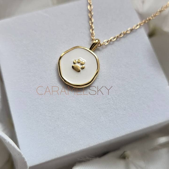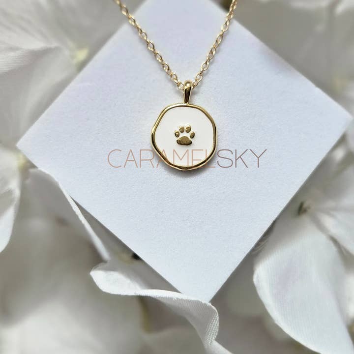 A timeless keepsake for pet lovers, this paw print enamel necklace is a beautiful way to honor the unconditional love of our furry companions. Featuring a 18K gold-plated paw print pendant with a subtle organic shape, on a white enamel background. Set on a 14K gold-plated stainless steel cable chain.