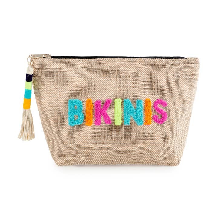 Jute and Pvc; Top Zip Closure. Keep Your Beach Essentials In Check With The “Bikinis” Zip Pouch! Made From Natural Woven Jute With Vibrant, Tufted Lettering That Screams Fun In The Sun, This Pouch Is Perfect For Storing Your Swimsuits, Sunscreen, Or Any Small Essentials. A Playful Tassel Zipper Pull Adds An Extra Touch Of Charm, Making It The Ultimate Accessory For Your Next Getaway.