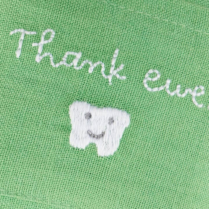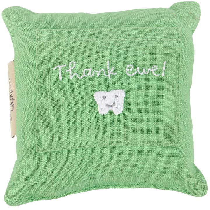 A cotton-linen blend pillow displaying a fun sheep design with “Dear Tooth Fairy – Please Stop Here” sentiment on the front. Tooth Fairy Pillow features pocket on the back to hold tooth or tooth fairy reward with a happy tooth design and “Thank Ewe!” sentiment. Designs and sentiments are embroidered for added interest. Contains polyester filling.