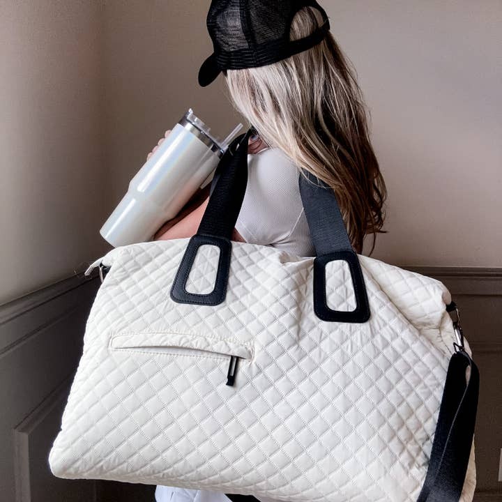 The Quilted Weekender in Off White Or Beige is the perfect travel companion. Its durable water-resistant outer and quilted design add a touch of luxury to your journey.